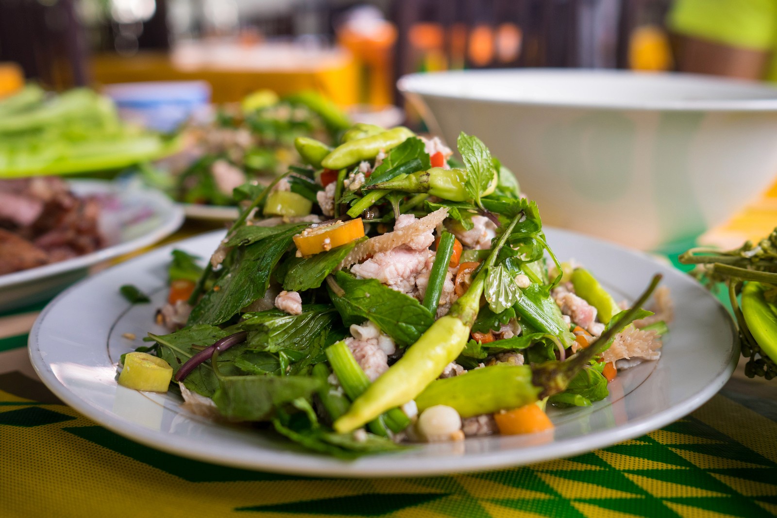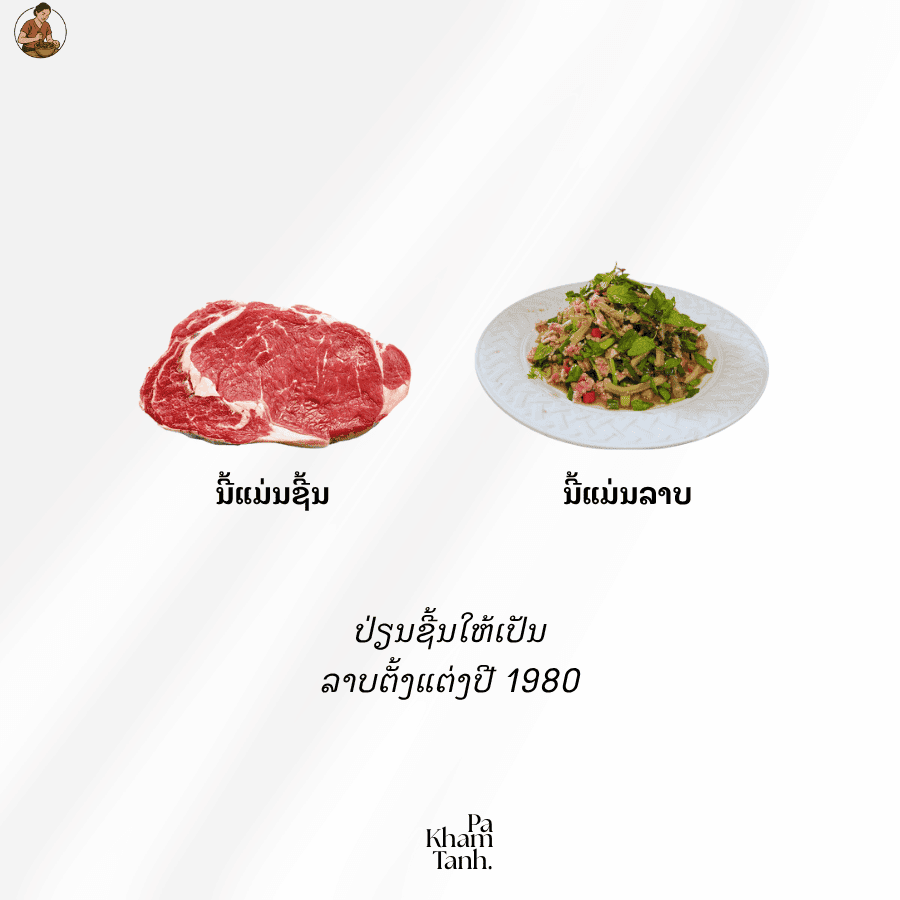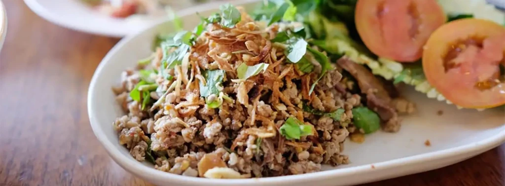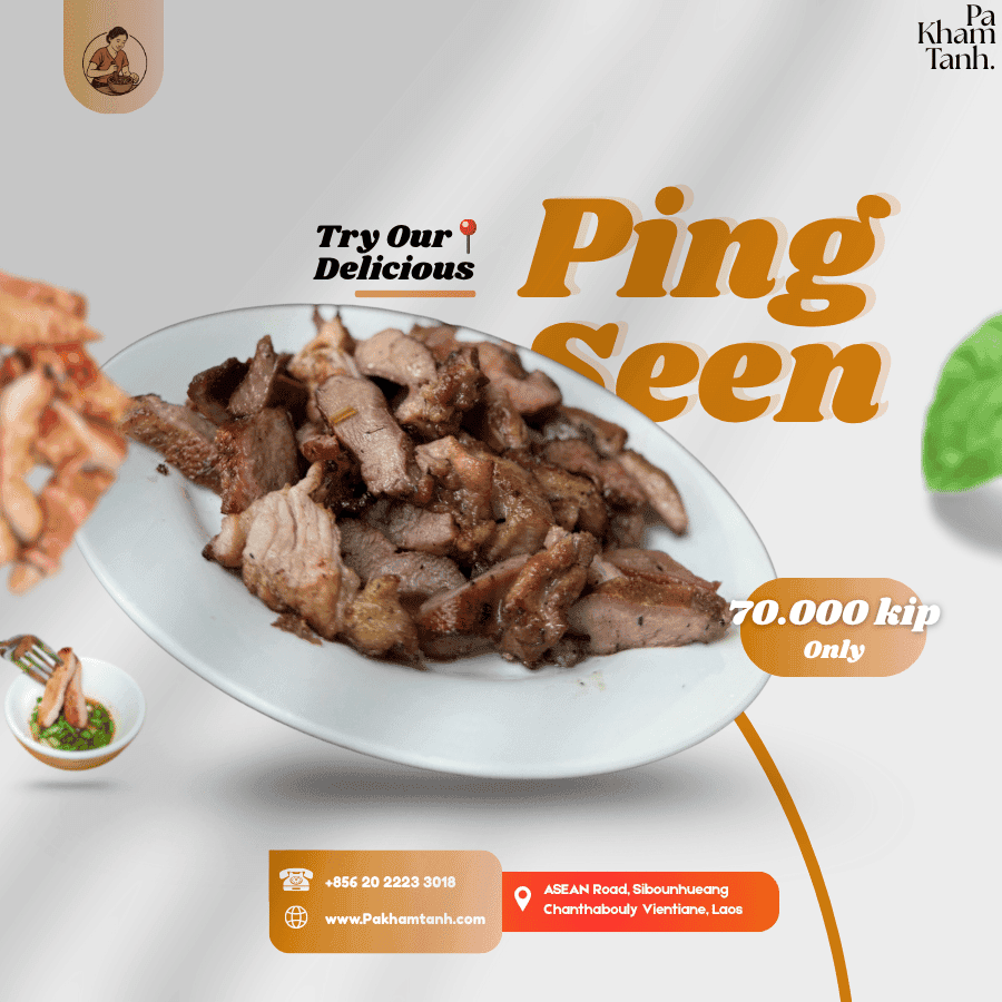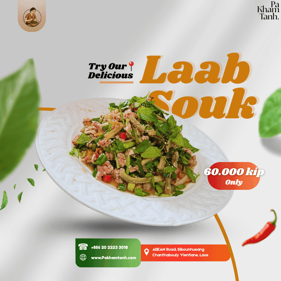 We specialize in traditional Lao cuisine, especially our signature Laab Souk (cooked minced meat salad), grilled pork, offal dishes, and spicy Lao salads.